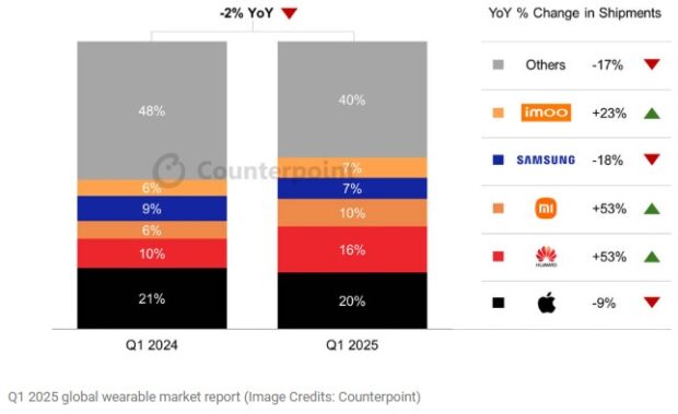 Küresel markalar arasında Huawei ve Xiaomi, 2025’in ilk çeyreğinde giyilebilir cihaz satışları segmentinde dikkat çekici bir artış sağladı. Her iki Çinli şirket de dünya genelindeki giyilebilir cihaz segmentinde büyük bir pay elde ederek yıllık bazda toplamda %53’lük bir sevkiyat artışına ulaştı.