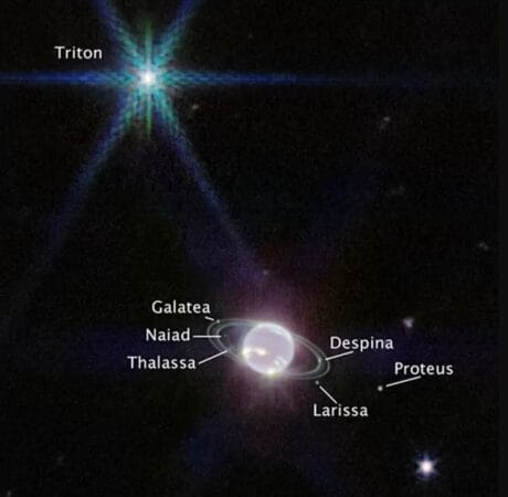 Bunların en göze çarpanı olan Triton, James Webb teleskobunun çektiği resimlerde yıldıza benzer bir şekle sahip.