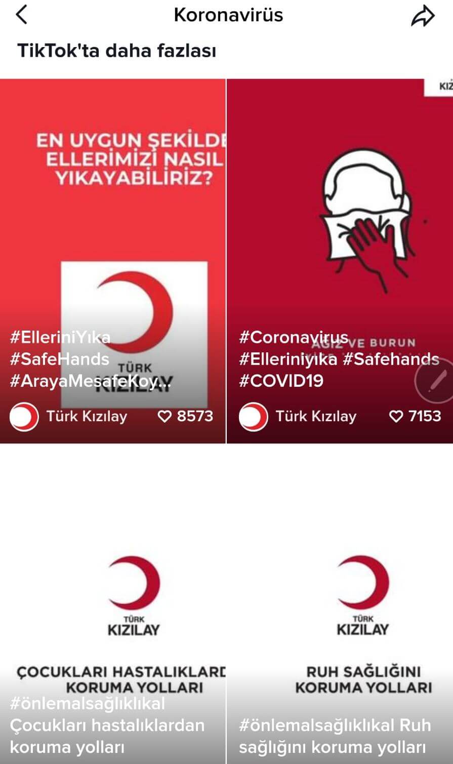 Popüler kısa video uygulaması TikTok Dünya Sağlık Örgütü ile yürüttüğü Covid-19 kampanyasının Türkiye ayağını Kızılay ile yürütüyor. Türk Kızılay’ın “Önlemini Al Sağlıklı Kal” kampanyası için kendi içeriklerini oluşturan tanınmış TikTok fenomenleri, Koronavirüsten nasıl korunabileceğimizi ve alınması gereken tedbirleri videolar aracılığıyla anlatıyor. Bu kapsamda TikTok fenomenleri Covid-19 farkındalık çalışmaları ve toplum sağlığı için paylaşımlar yapıyor. Hastalıktan nasıl korunulacağına dair içerikler paylaşılan videoların yanı sıra kullanıcılar da kendilerine has önlemlerini #önlemalsağlıklıkal etiketiyle paylaşabiliyorlar.
