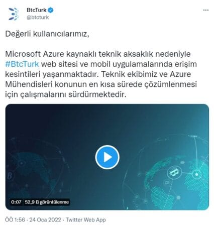 Microsoft Azure kaynaklı teknik aksaklık nedeniyle #BtcTurk web sitesi ve mobil uygulamalarında erişim kesintileri yaşanmaktadır. Teknik ekibimiz ve Azure Mühendisleri konunun en kısa sürede çözümlenmesi için çalışmalarını sürdürmektedir.