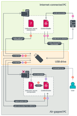 “Bir kurban, ele geçirilmiş bir USB sürücüsünü izole bir sisteme taktığında ve klasör simgesine sahip ancak aslında kötü niyetli bir yürütülebilir dosya olan bir bileşene tıkladığında GoldenDealer yüklenir ve çalıştırılır, izole sistem hakkında bilgi toplamaya başlar ve bunları USB sürücüsünde depolar. Sürücü tekrar internete bağlı bilgisayara takıldığında GoldenDealer USB sürücüsünden ağdan izole bilgisayar hakkındaki bilgileri alır ve C&C sunucusuna gönderir. Sunucu, izole bilgisayarda çalıştırılacak bir veya daha fazla yürütülebilir dosyayla yanıt verir. Son olarak, sürücü tekrar izole PC’ye takıldığında GoldenDealer sürücüden yürütülebilir dosyaları alır ve çalıştırır. GoldenDealer zaten çalıştığı için kullanıcı etkileşimine gerek yoktur” diye açıklıyor Porolli.