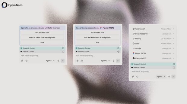 Opera, Opera Neon’u geliştirirken kullanıcıların farklı ihtiyaçlarına hizmet eden üç ayrı ajan tanıttı; Chat, Make ve Do. Bu sayede kullanıcılar, o anki görev için en uygun ajana diledikleri anda kolayca başvurabiliyor. Aynı zamanda gelecekteki ajan sayısı da önemli ölçekte arttırılarak her görev için en uygun ajan, kullanıcı müdahalesine gerek kalmadan otomatik olarak devreye girmesini sağlıyor. Bununla birlikte Opera süreci daha sezgisel hale getiren yeni bir kullanıcı arayüzü de sunuyor. Bu arayüz sayesinde Opera Neon, belirli bir görev için doğru ajan grubu seçilmesine yardımcı oluyor.