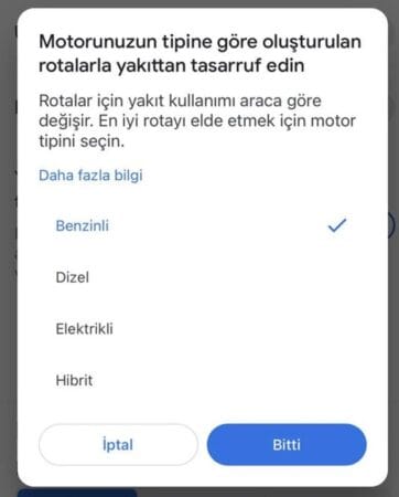 Uygulama artık, ‘Benzinli’, ‘Dizel’, ‘Elektrikli’ ve ‘Hibrit’ araçlar için en az yakıt tüketen rotalar oluşturulabiliyor. Google, bu seçeneklerden aracına uygun olanı seçen kullanıcılara, motor tipine ve yol durumuna göre yakıt açısından en tasarruflu rotayı oluşturuyor.
