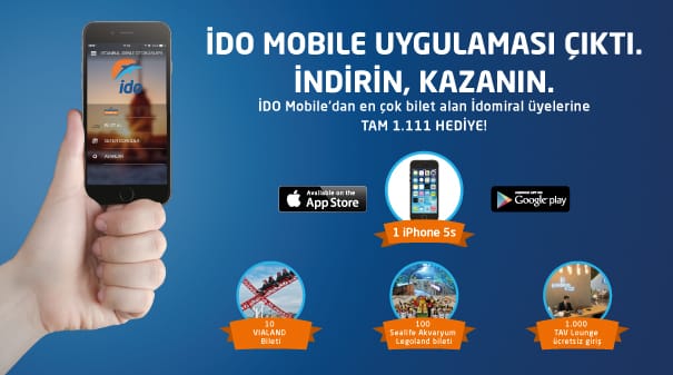 Google Play ve iTunesStore’dan indirilebilen İDO Mobil uygulaması, kullanıcılarına lansmana özel binlerce hediye fırsatı da sunuyor. İDO Mobil uygulamasından İdomiral üyeliğiyle giriş yaparak en çok bilet alan 1 kişi iPhone 5s, 10 kişi Vialand bileti, 100 kişi Sealife Akvaryum- Legoland bileti ve 1000 kişi de TAVLounge’a ücretsiz giriş şansı yakalıyor.