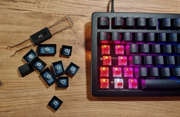 %75 form faktörlü olan bu oyun klavyesi her seviyede kişiselleştirme ve özelleştirmeye imkan veriyor. Tuş anahtarları ve manyetik üst plakalar ve rozetler çalışırken değiştirilebiliyor. Klavyenin genel tasarımı standart bir oyuncu klavyesi gibi görünse de, HyperX’in Alloy Rise ile yarattığı özelleştirme seçenekleri onu diğer rakiplerinden ayırıyor. Kasanın üst kısmı manyetik yapıda ve şirket, klavyenin tasarımını zenginleştirmek için farklı renk seçenekleri satıyor ve üst paneli değiştirebiliyorsunuz.
