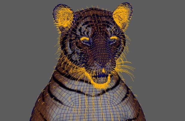 Righi, Maya içindeki XGen interaktif groom-editor ile oluşturulan detaylı, gerçekçi kürkle son derece fotoğrafa yakın bir görünüm elde etmeye öncelik veriyor. Righi, “Başlamadan önce, kaç tane kürk tanımına ihtiyacım olacağına karar verebilmem için kürk akışını incelemek çok önemli. Örneğin kaplan, ana gövde, kafa, yanaklar ve bıyık gibi 10 tanımlama ile yapılıyor.” diyor.