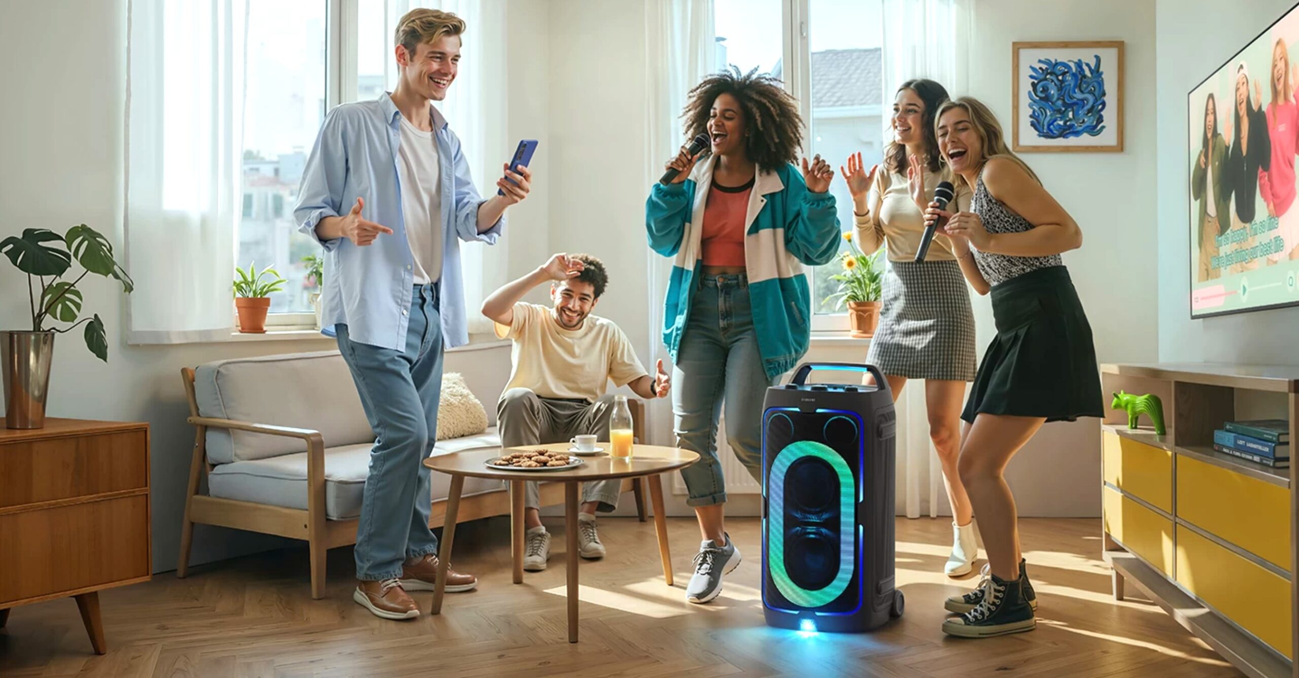 Şimdi ışıklara ve renklere geçelim (sonuçta bu bir parti hoparlörü). Samsung, 360° etki için geliştirilmiş bir aydınlatma sistemi ekledi. Işıklar beş alana yayılmış durumda; tutma kolu ışığı hem kontrolleri aydınlatıyor hem de bir telefon tutabiliyor.