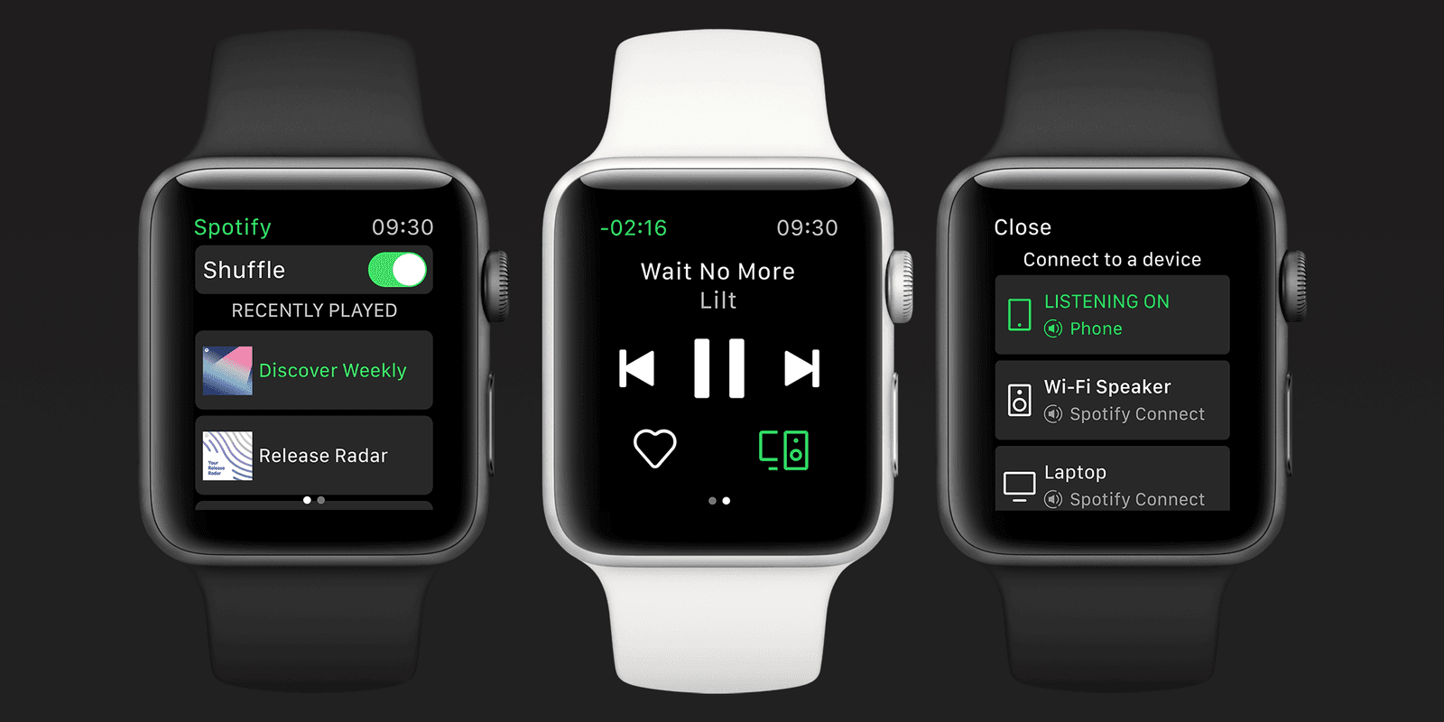 Partilerden söz etmişken, saatinizle DJ’lik yapmak için Spotify Connect ile hoparlörünüze ya da başka bir cihaza bağlanmanız yeterli.