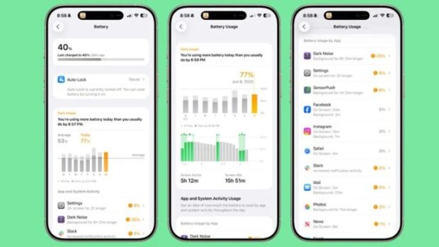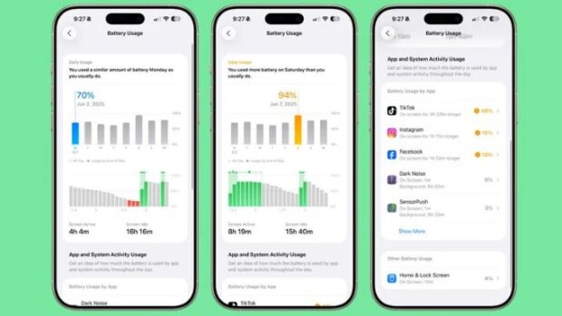 iOS 26’da Apple, Ayarlar uygulamasındaki Pil bölümünü baştan sona yenileyerek iPhone kullanımınızın pil ömrünü nasıl etkilediğine ve uygulamaların ne kadar pil harcadığına dair çok daha derinlemesine bilgiler sunuyor. Ayrıca yeni pil yönetim araçları da eklendi.