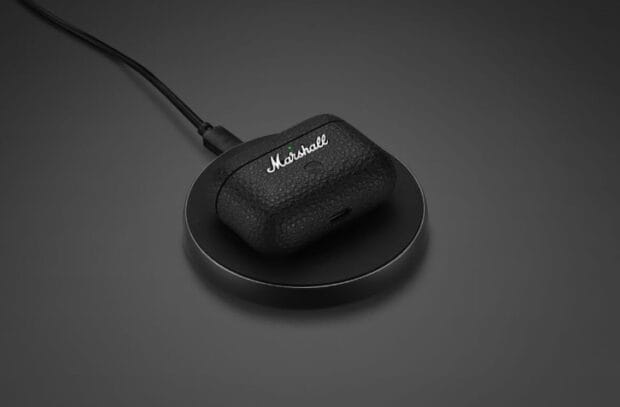 Şarj kutusunun üzerinde USB-C girişi var ve bu port üzerinden şarj edebiliyoruz. İstersek kablosuz şarj edebilme imkanımız da var. Şarj kasası suni deri kaplaması ve kaymaz dokusu sayesinde elinize rahatça oturuyor ve az önce belirttiğim gibi tasarımı gerçekten de yüksek kaliteli olduğunu fazlasıyla hissettiriyor. Menteşeli kapaktaki mıknatıs da güçlü bir yapıda ve tek elle kolayca açılabilen kılıfı güvenli bir şekilde kapalı tutuyor. Eşleştirme düğmesi tasarımın içinde oldukça ufak bir detay ve pek belirgin değil. Marshall logosunun altına konumlandırılmış ve logo ile aralarında bir de LED’imiz var. Bu LED üzerinden batarya durumunu takip edebiliyoruz.